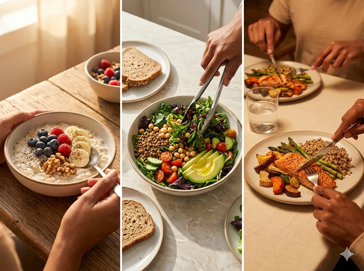 Simple meal templates for morning, lunch, and dinner with the reason behind each pattern.
