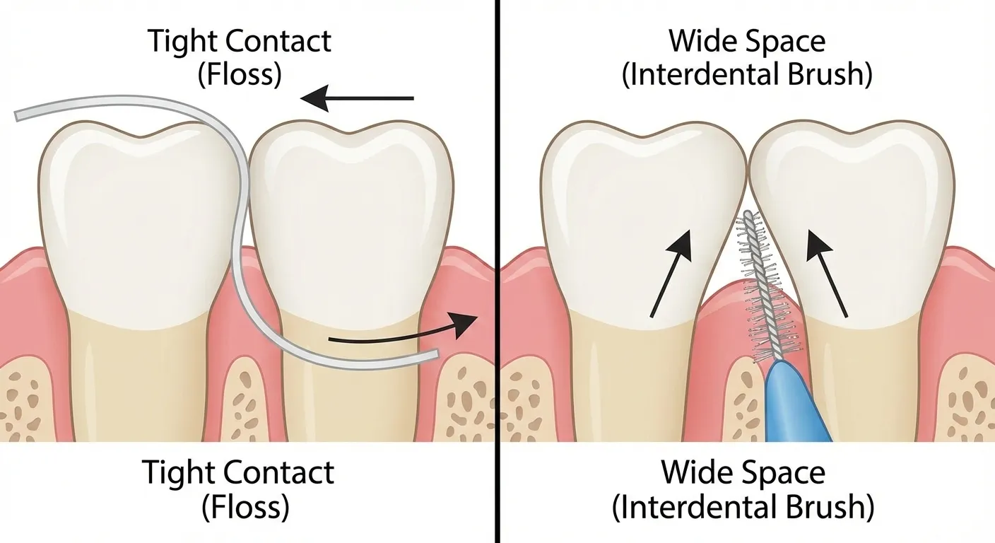 Understand the difference between floss and interdental brushes based on tooth contact points and interdental spaces.